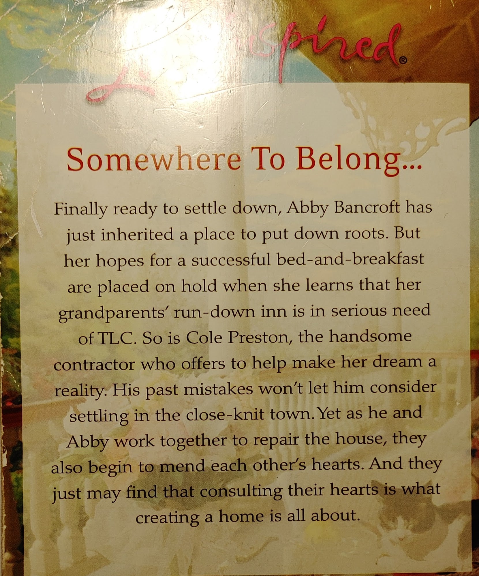 Finally ready to settle down, Abby Bancroft has just inherited a place to put down roots. But her hopes for a successful bed-and breakfast are placed on hold when she learns that her grandparents run down inn is in serious need of TLC. So is Cole Preston, the handsome contractor who offers to help ,her dream a reality. His past mistakes won't let him consider settling in the close-knit town. Yet as he and Abby work together to repair the house, they7 also begin to mend each other's hearts. They just may find that consulting their hearts is what creating a home is all about.
