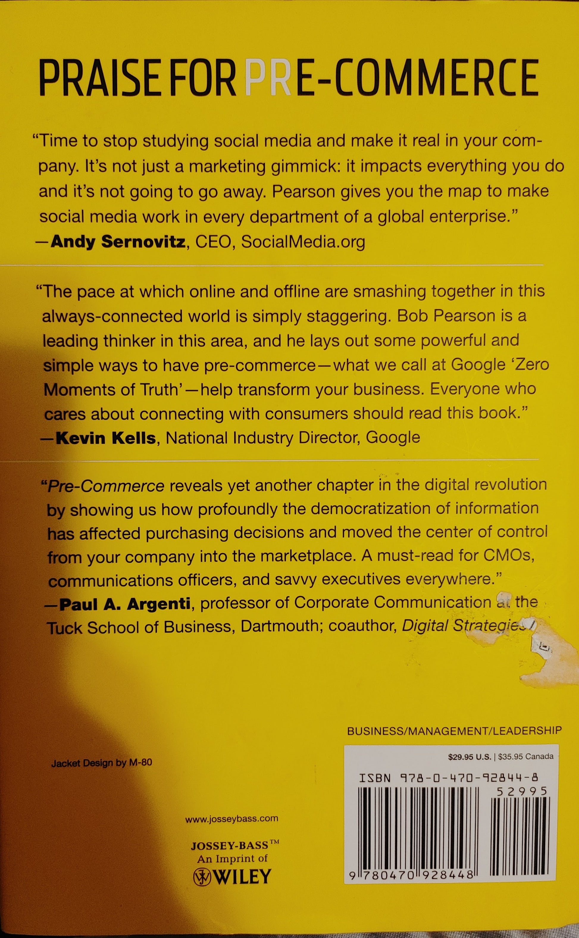Since its debut E-commerce has been centered on the transaction, which represents less than one percent of the time we spend online. Now, we are entering the era of Pre-Commerce where customers make their own decision to buy or support a brand before the transaction. Pre-Commerce explains how the exploding use of social media channels has fundamentally changed the way customers go about making their purchasing decisions, how they educate themselves and why they choose to support certain brands above others. It shows what executives must do to re-create the way their companies interact with and learn from their customers, employees and competitors. It includes exclusive interviews and anecdotes Pearson has conducted or experienced with numerous influential C-suite executives during his time as leader of Dell’s global social media team and as a consultant to Fortune 1000 companies, worldwide.